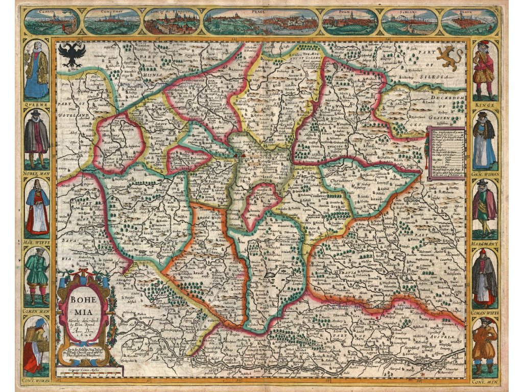 Nad mapou se nachází zobrazení 5 českých měst - Čáslav, Chomutov, Praha, Polná, Slaný, Louny plus Hradčany, po stranách jsou postavy různých stavů v dobových krojích.